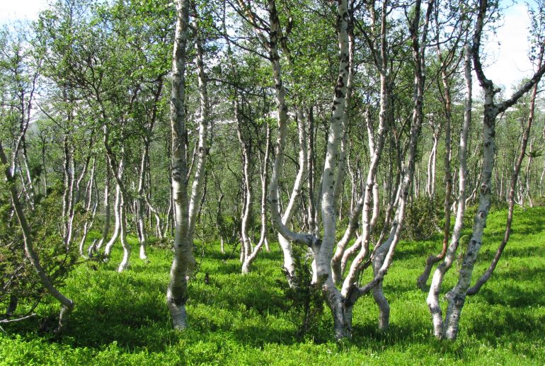 Het Fjellberkenbos ligt als een gordel boven het productieve naaldbos.