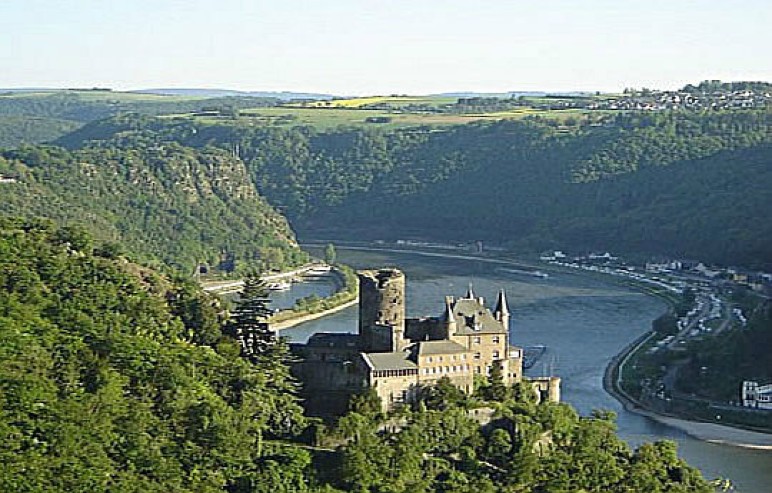 Uitzicht op de burcht Katz nabij St. Goarshausen. Links op de achtergrond de Loreley.