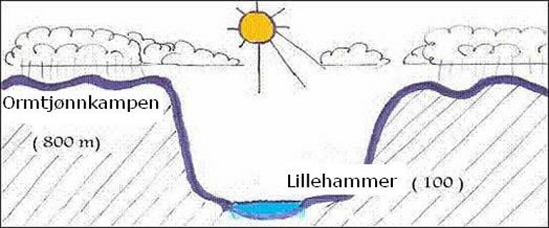 Stel je kampeert in de fjell bij Ormtjønnkampen en het weer slaat ‘snachts om. Het gaat licht regenen. Je bent hier op 800 m hoogte. Het Gudbrandsdal ligt op iets meer dan 100 m hoogte. Dit hoogteverschil is precies voldoende om dan in Gudbrandsdalen geen regen te hebben.