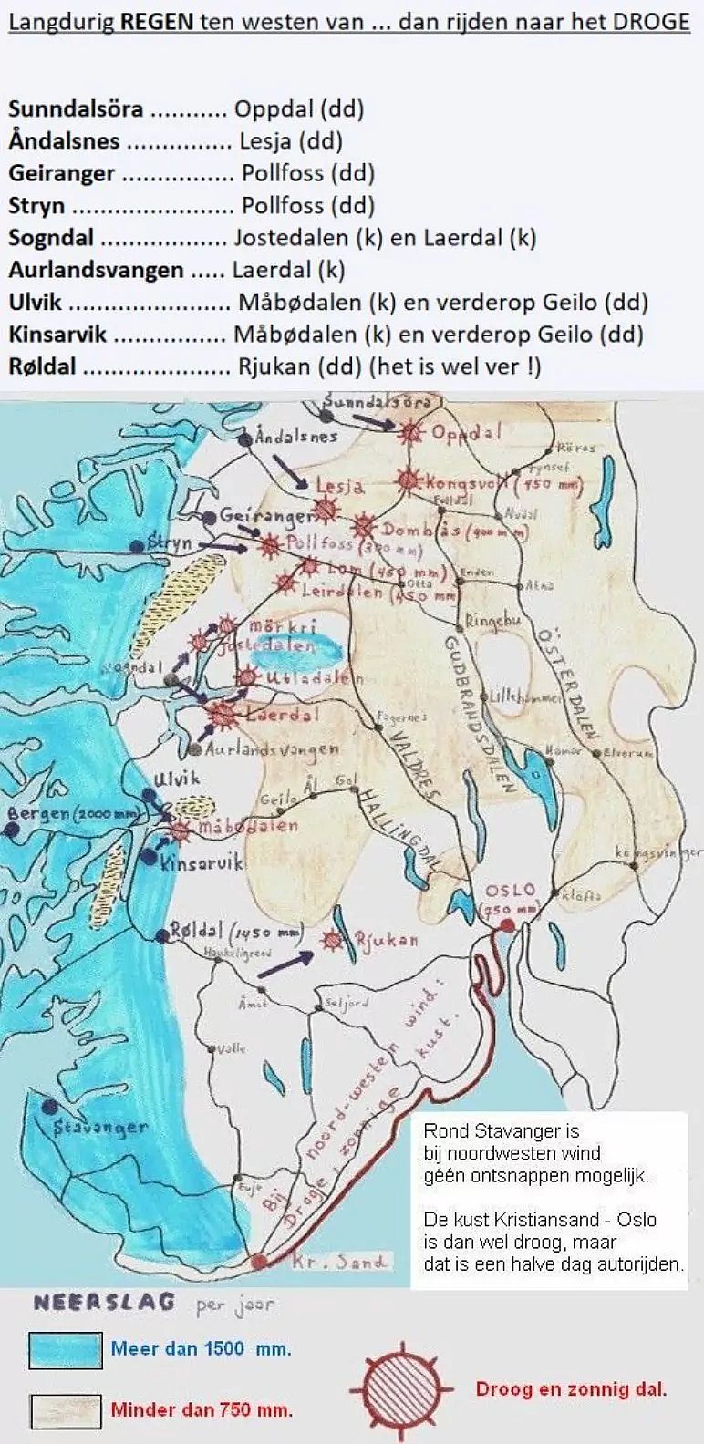 Helaas kun je ten westen van Setesdal (o.a. Stavanger e.o.) niet ontsnappen naar een droog gebied. De kust Kristiansand – Oslo is dan wel droog, maar dat is een halve dag rijden vanuit Stavanger.